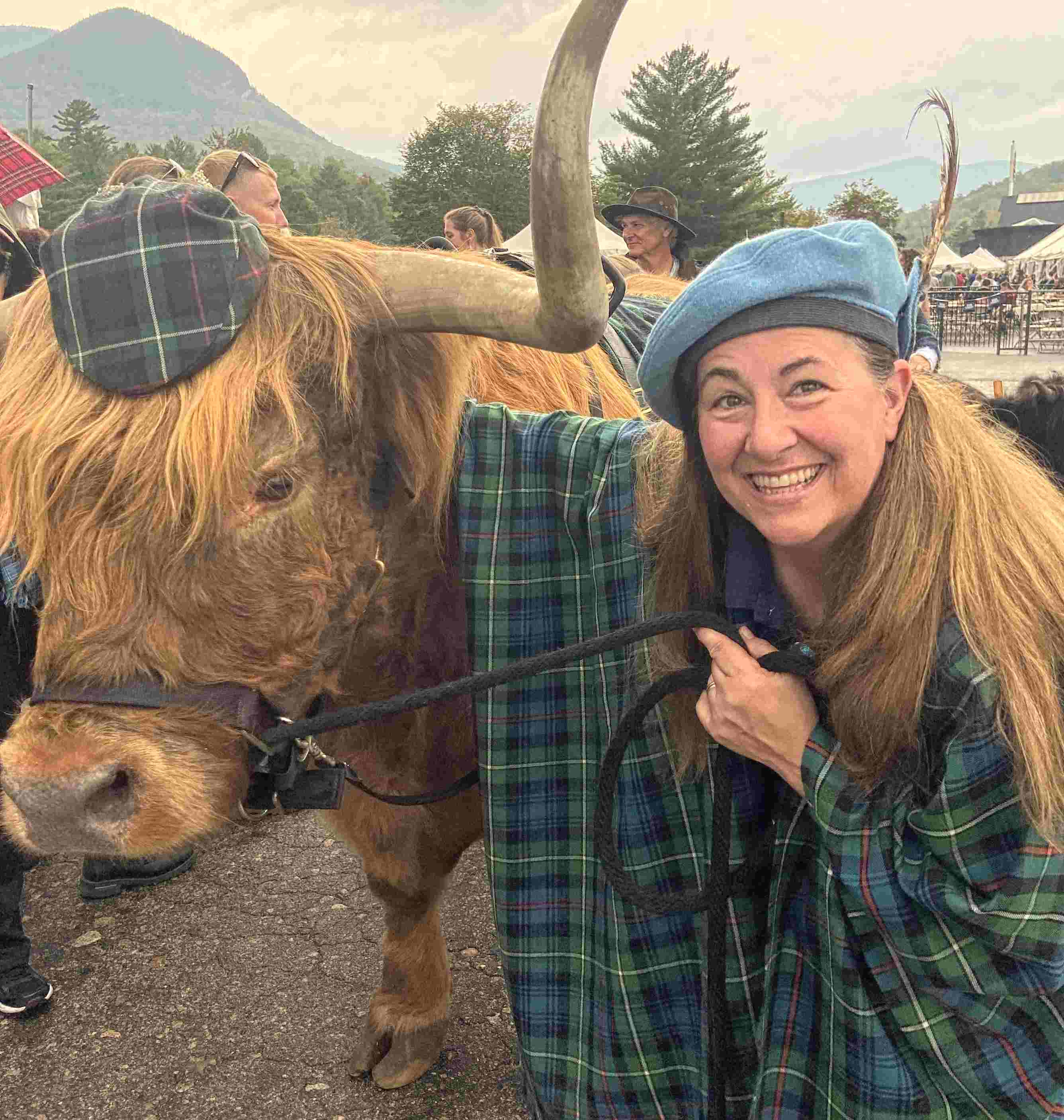 The sound of bagpipes filled the air as Curious Bleu, looking rakish in his MacKenzie tartan cap, clip-clopped onto the parade grounds. Bleu, a 10-year-old Scottish Highlander steer, and his sidekick, year-old Daffodil, were part of the spectacle of the 47th Annual New Hampshire Highland Games and Festival (hosted by NHSCOT) in Lincoln. They were there to add ambiance. After all, what could be more Scottish than Scottish Highlander cattle?